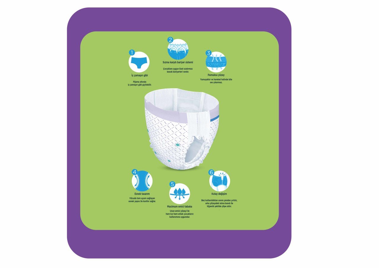 Canped Kids Çocuklar İçin Emici Külot, Bez kullandıktan sonra yandan yırtılarak, bezin arka tarafındaki atma bandı ile hijyenik şekilde çöpe atılır.