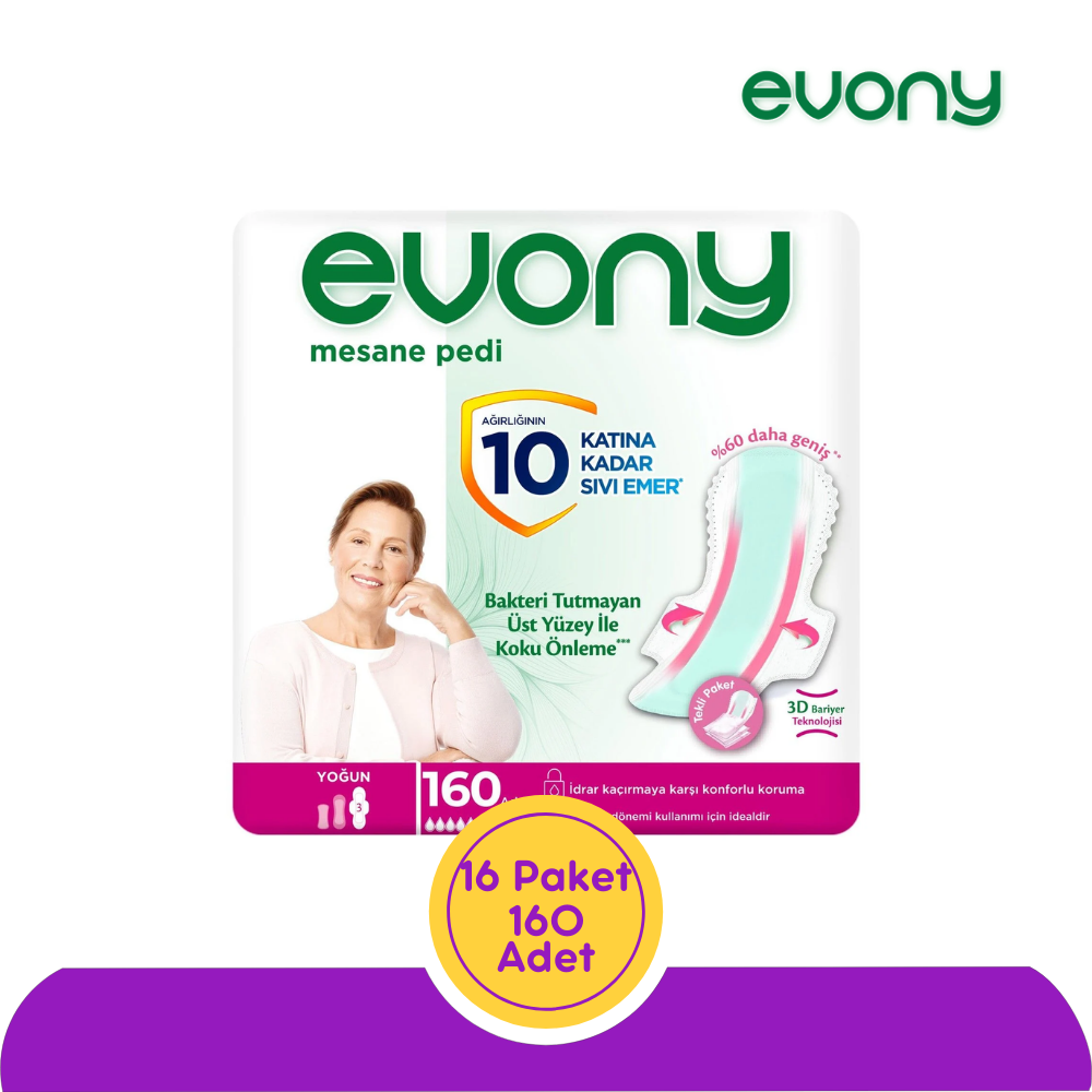 - Evony Günlük Mesane Pedi Ekstra Uzun'a göre %60 daha geniş arka yüzeyi ve 3D bariyer teknolojisi ile sızdırmalara karşı koruma sağlar.